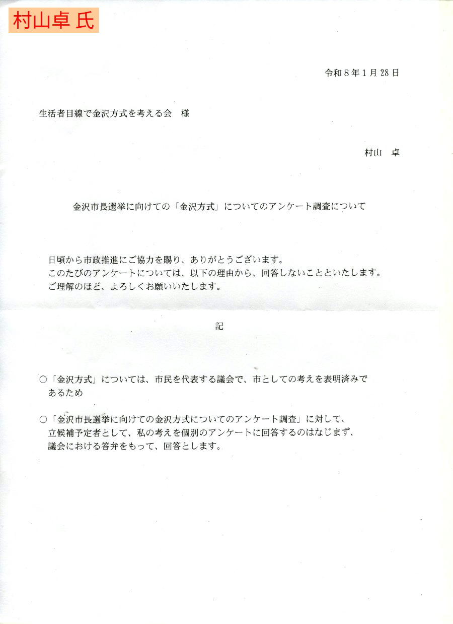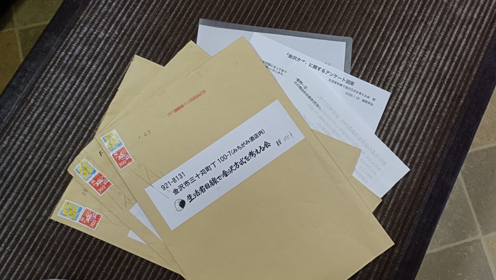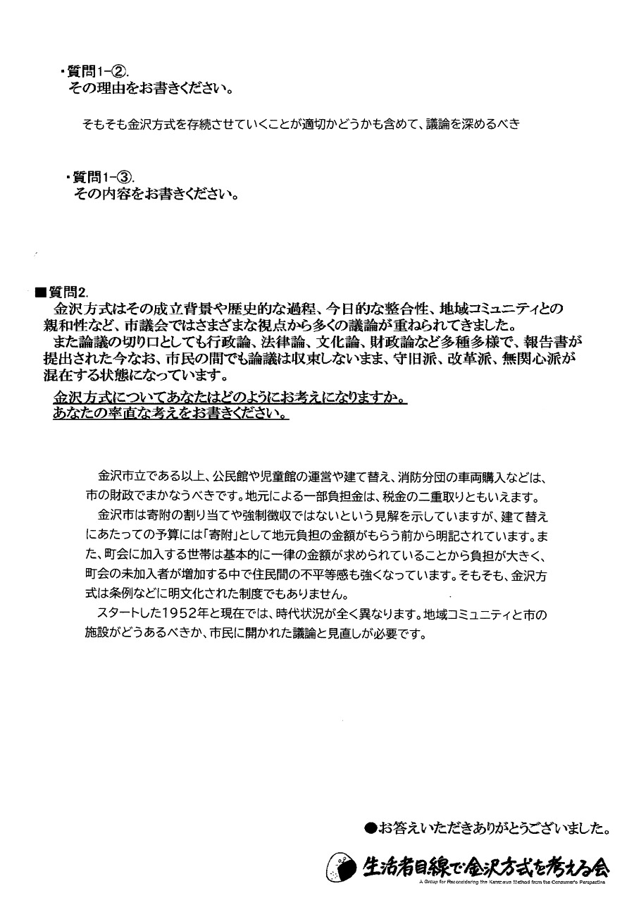 との見出しで、生活者目線で金沢方式を考える会が立候補を表明している4人へのアンケートアンケート結果を公表したといった記事を掲載いただきました、是非ご覧下さい
