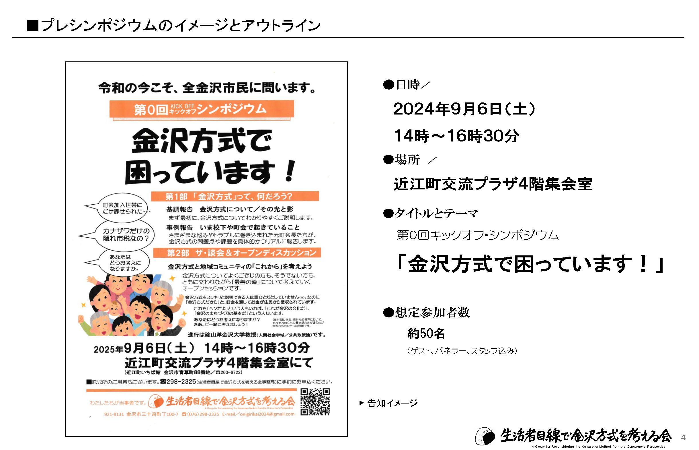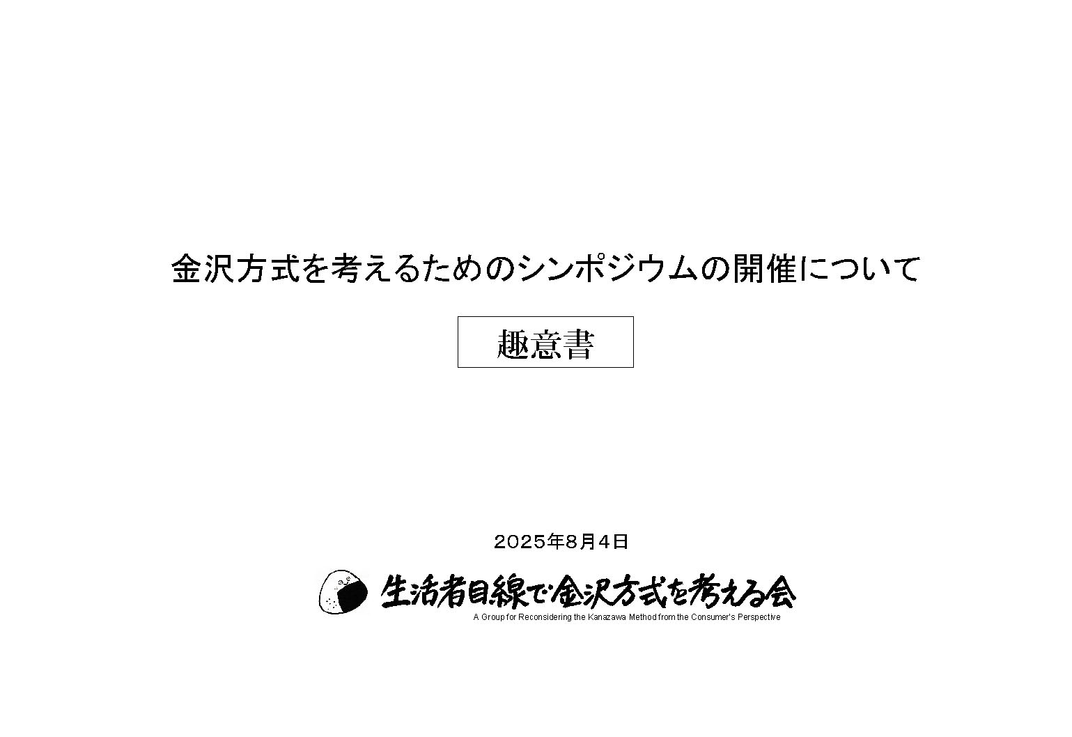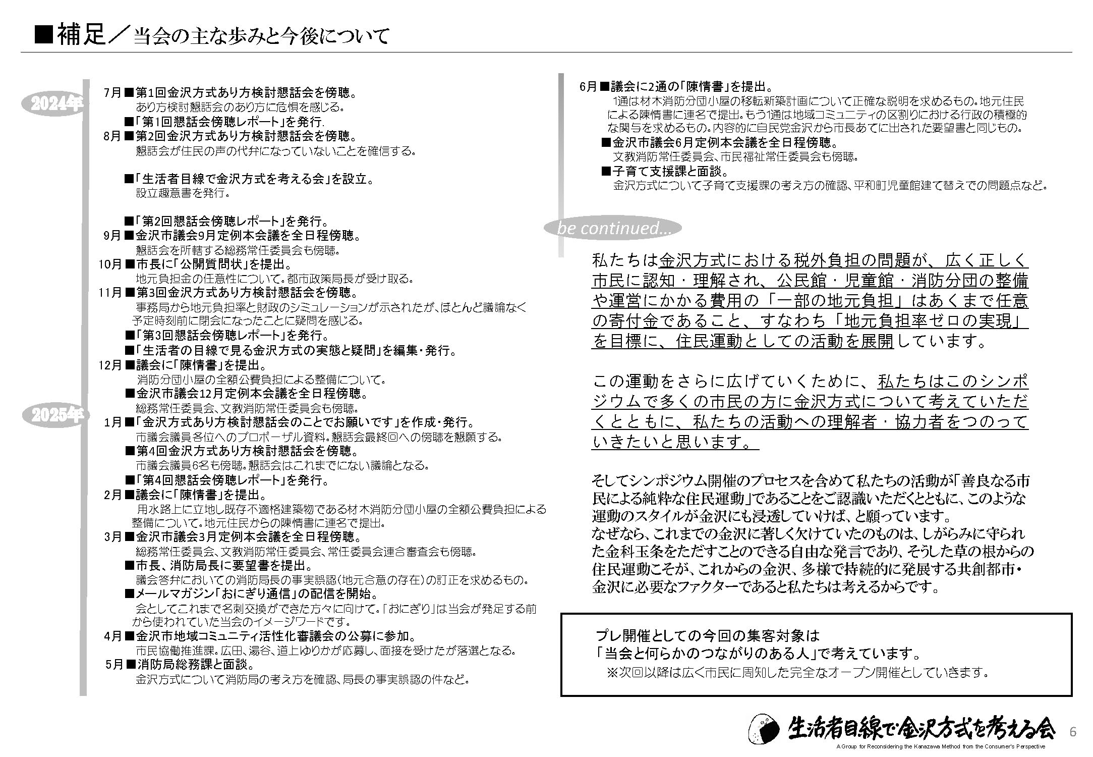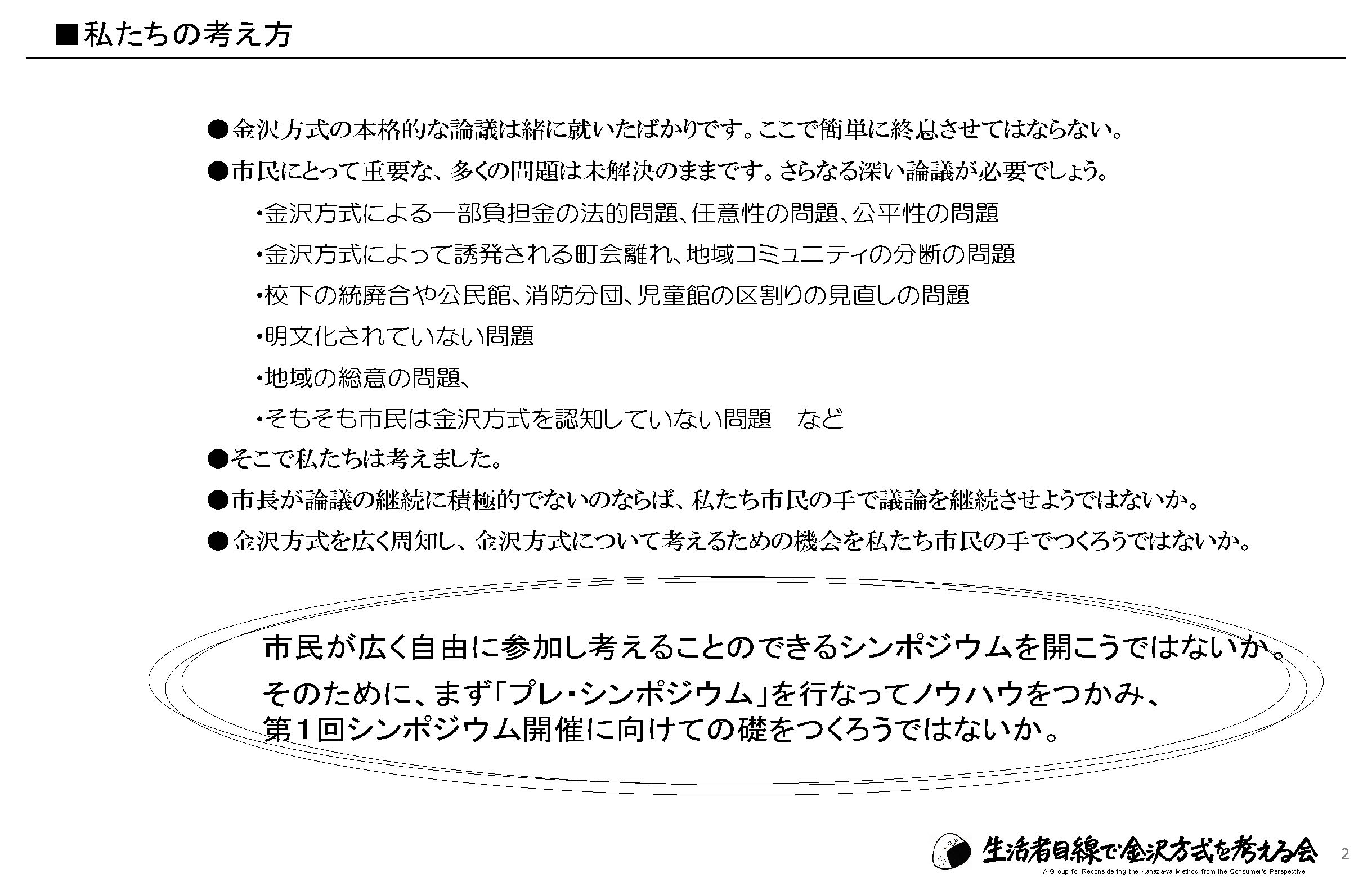 この運動をさらに広げていくために、私たちはこのシンポジウムで多くの市民の方に金沢方式について考えていただくとともに、私たちの活動への理解者・協力者をつのっていきたいと思います。