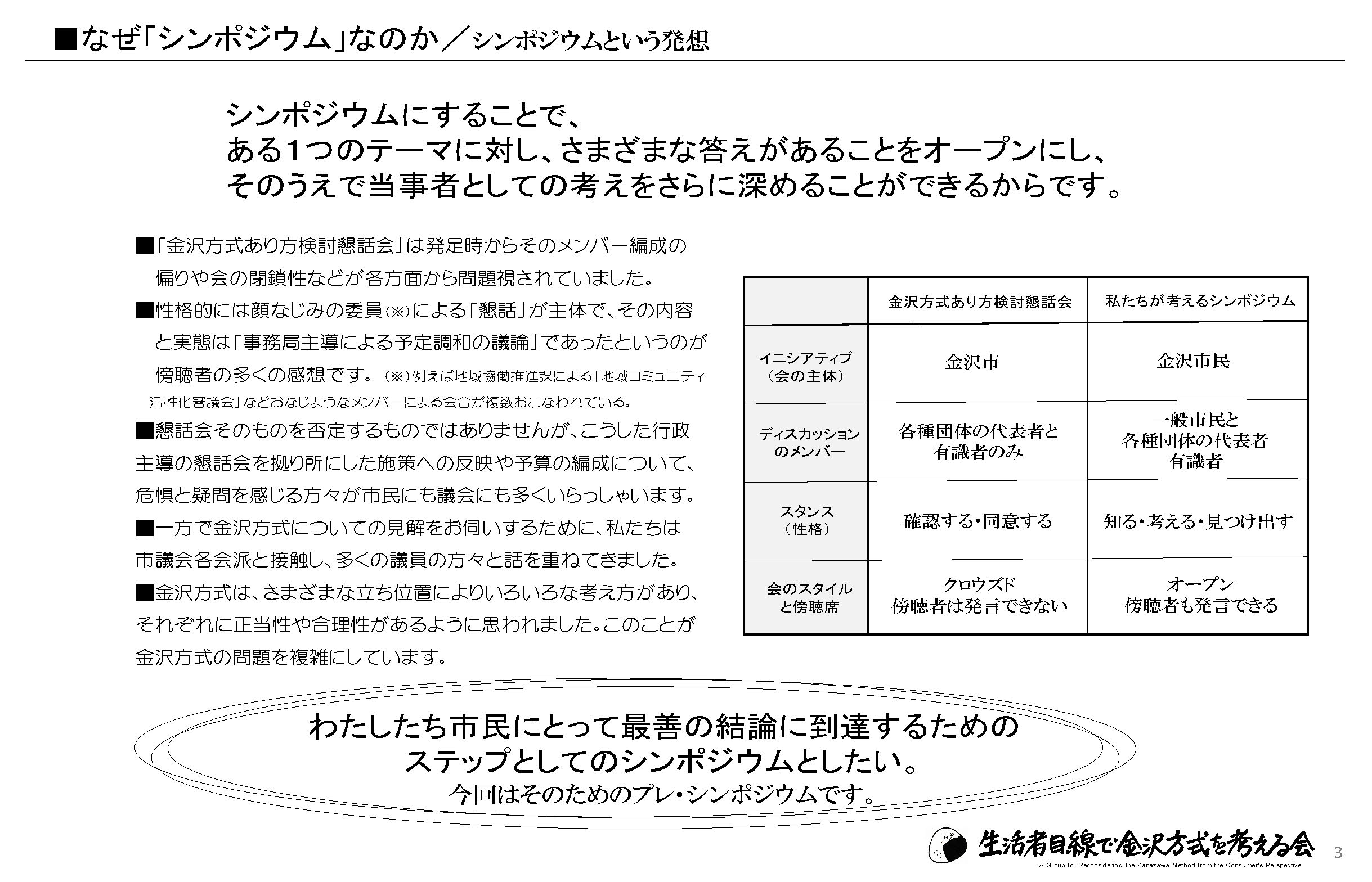 わたしたち市民にとって最善の結論に到達するためのステップとしてのシンポジウムとしたい。