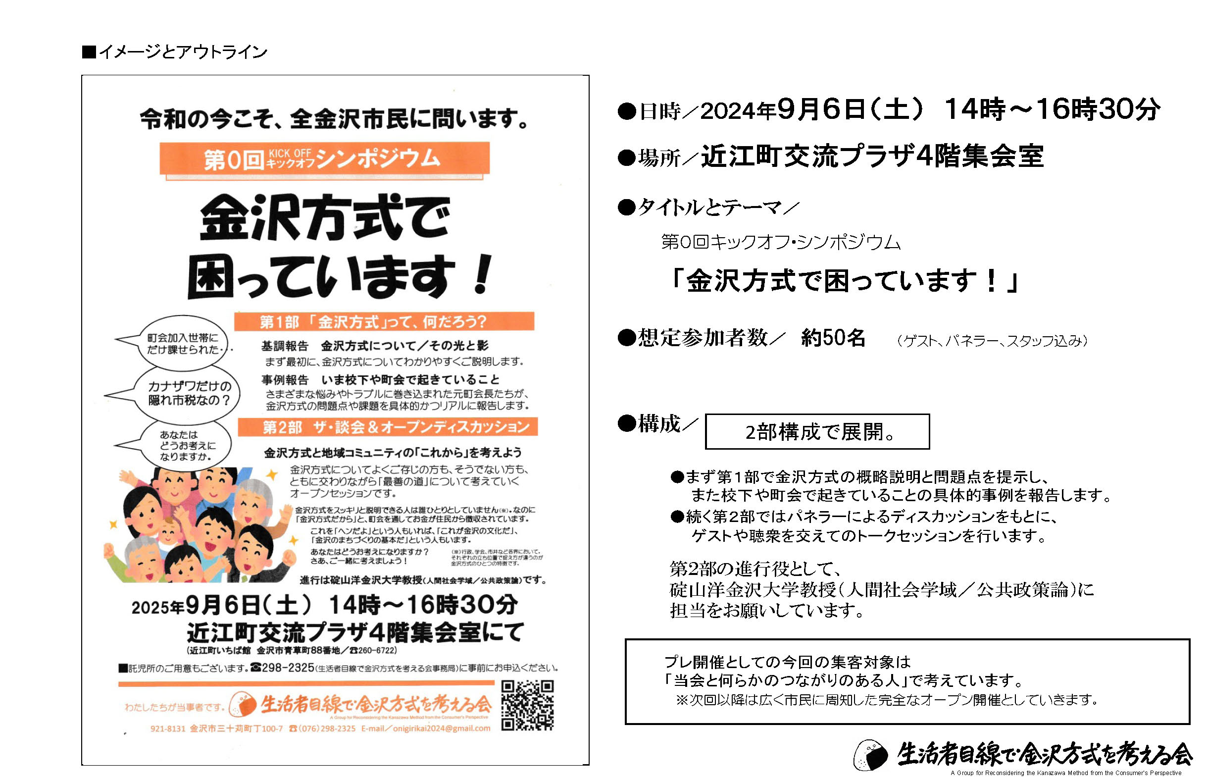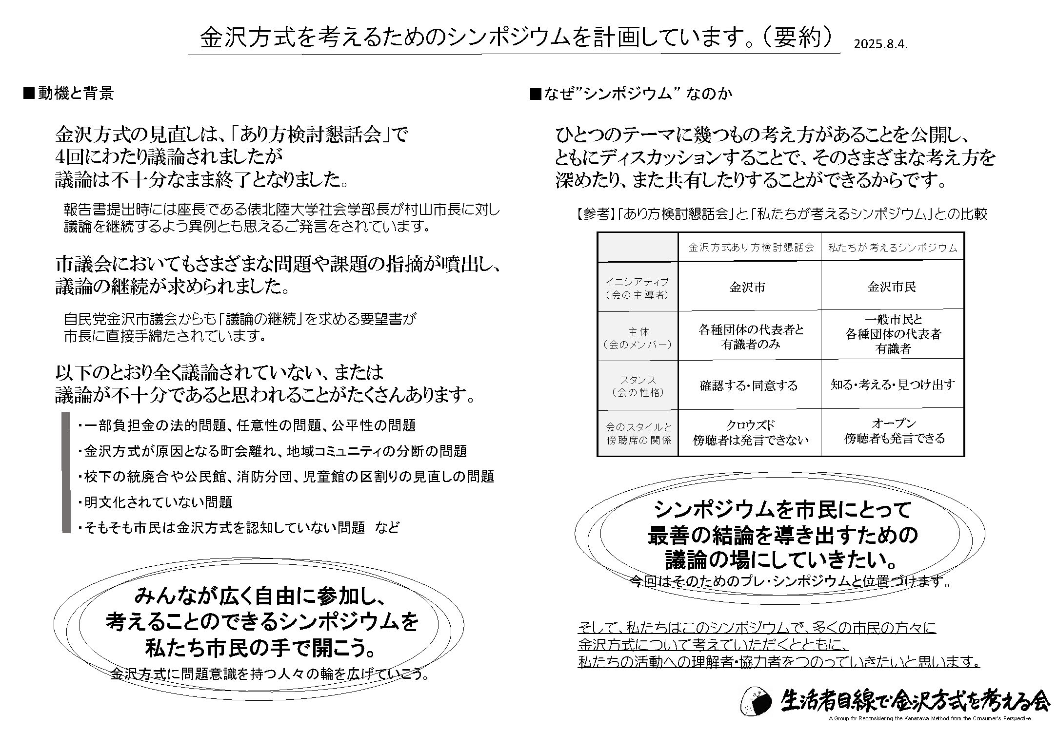 そして、私たちはこのシンポジウムで、多くの市民の方々に金沢方式について考えていただくとともに、私たちの活動への理解者・協力者をつのっていきたいと思います。