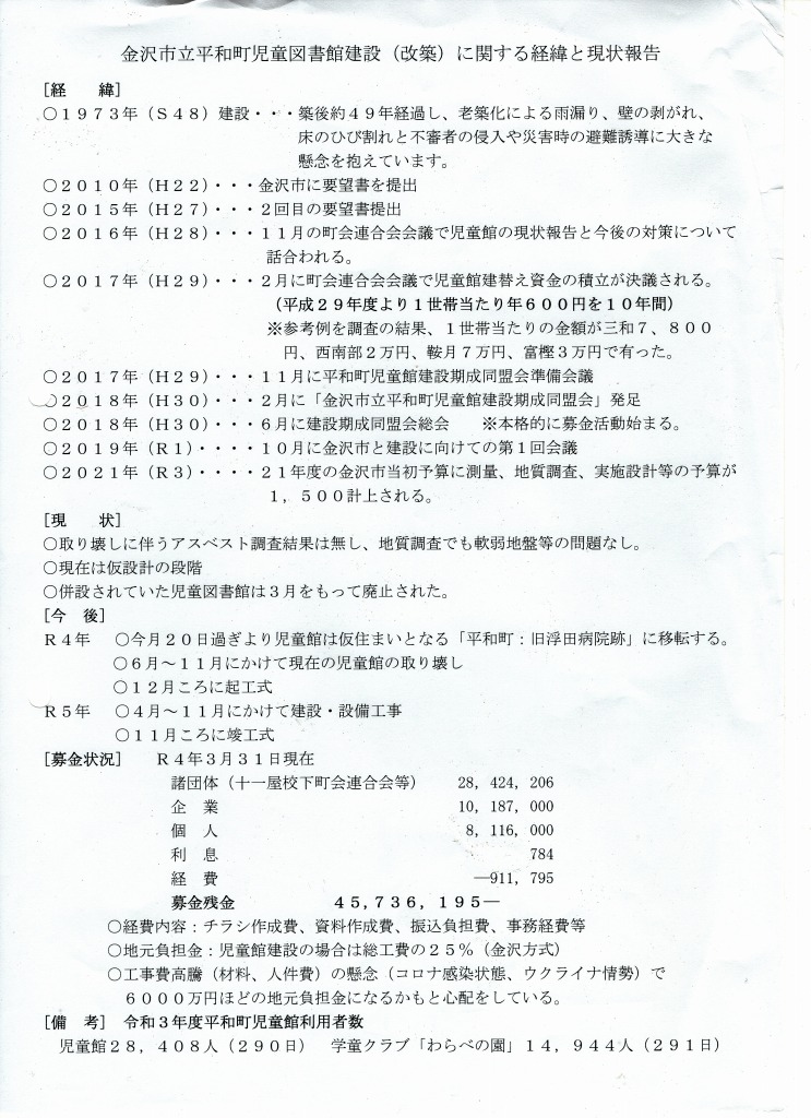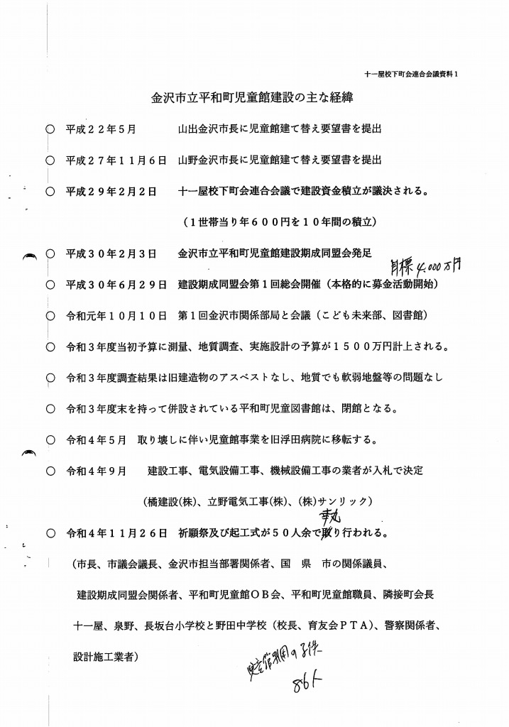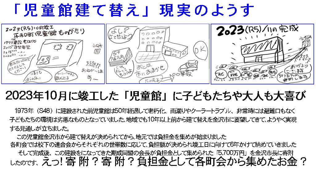 他にもいろいろ出来事の中で建設が行われ、金沢市の建設にあたっての地元との合意のあり方や、業者選定や設備選定は児童館建設にふさわしいものだったのか