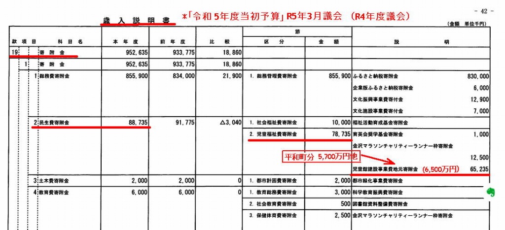 予算書、19款「寄附金欄」に平和町児童館分「5,700万円」が計上されている