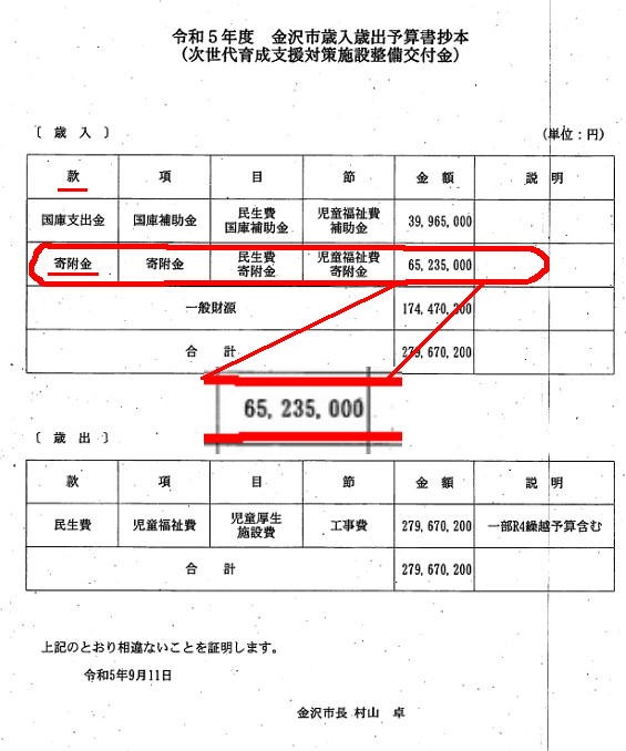 「金沢方式」では、建設年度の当初予算に「地元寄附金」(当時は 1/4)が計上される