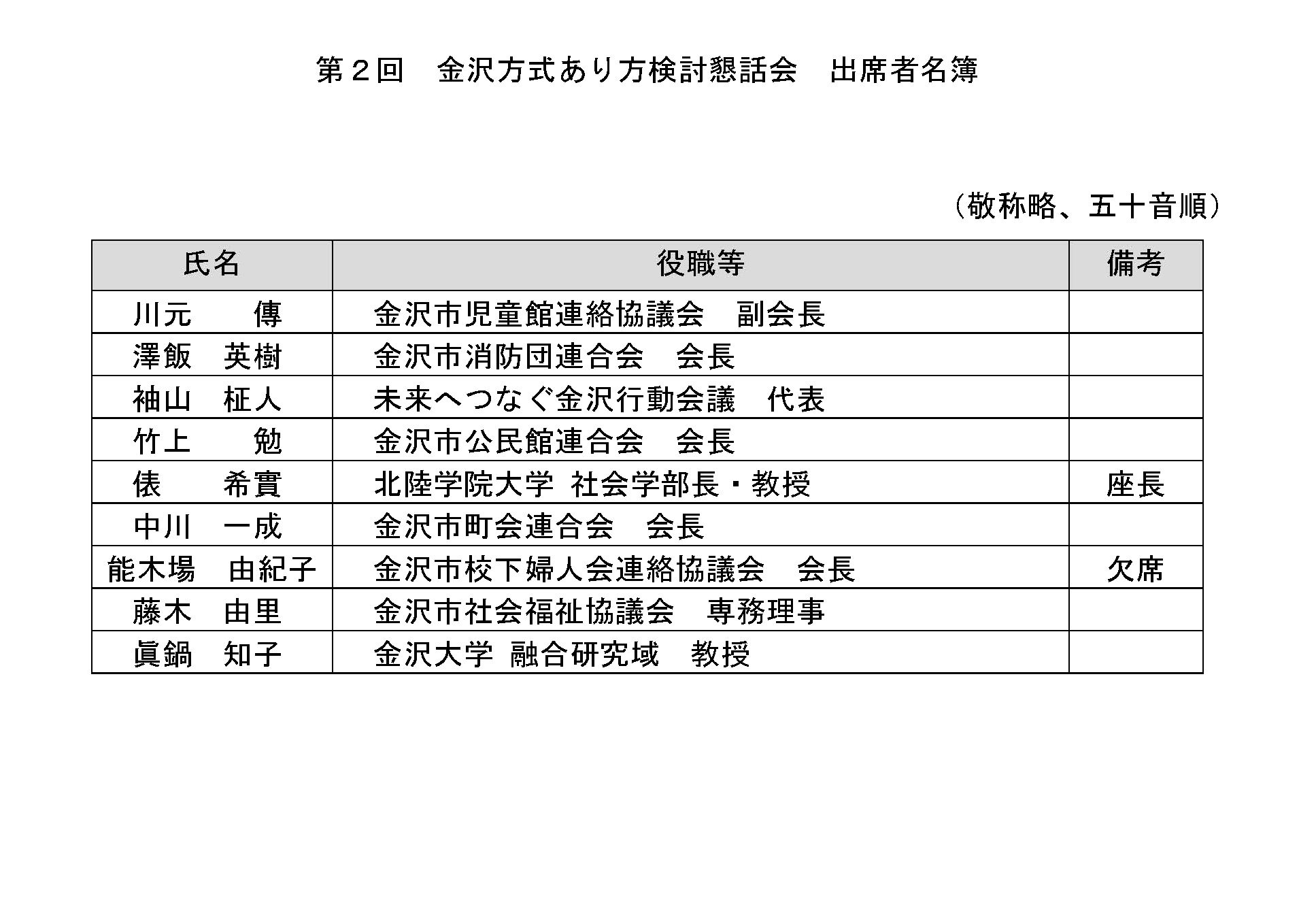 第2回 金沢方式あり方検討懇話会 委員名簿 出席者名簿 (敬称略、五十音順)