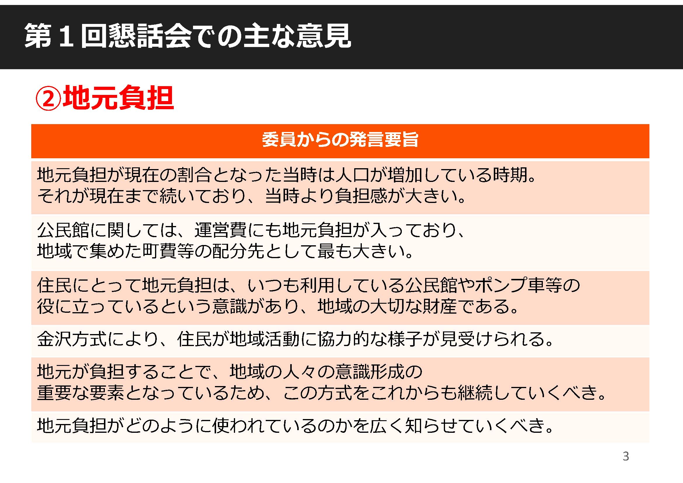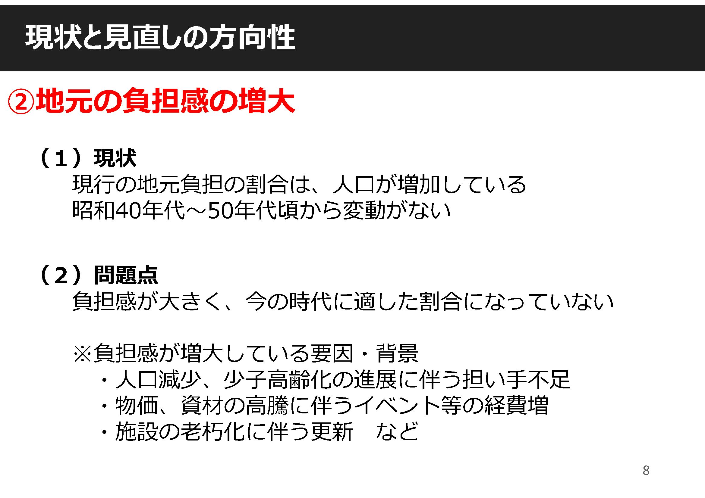 ○人口が増加している時期に設定した地元負担割合が現在まで残っており、若い世代の世帯数が減っていることで、負担感が増していると地域から声が上がっている。これからの人口減少も踏まえて、地元負担割合は再検討いただきたい。