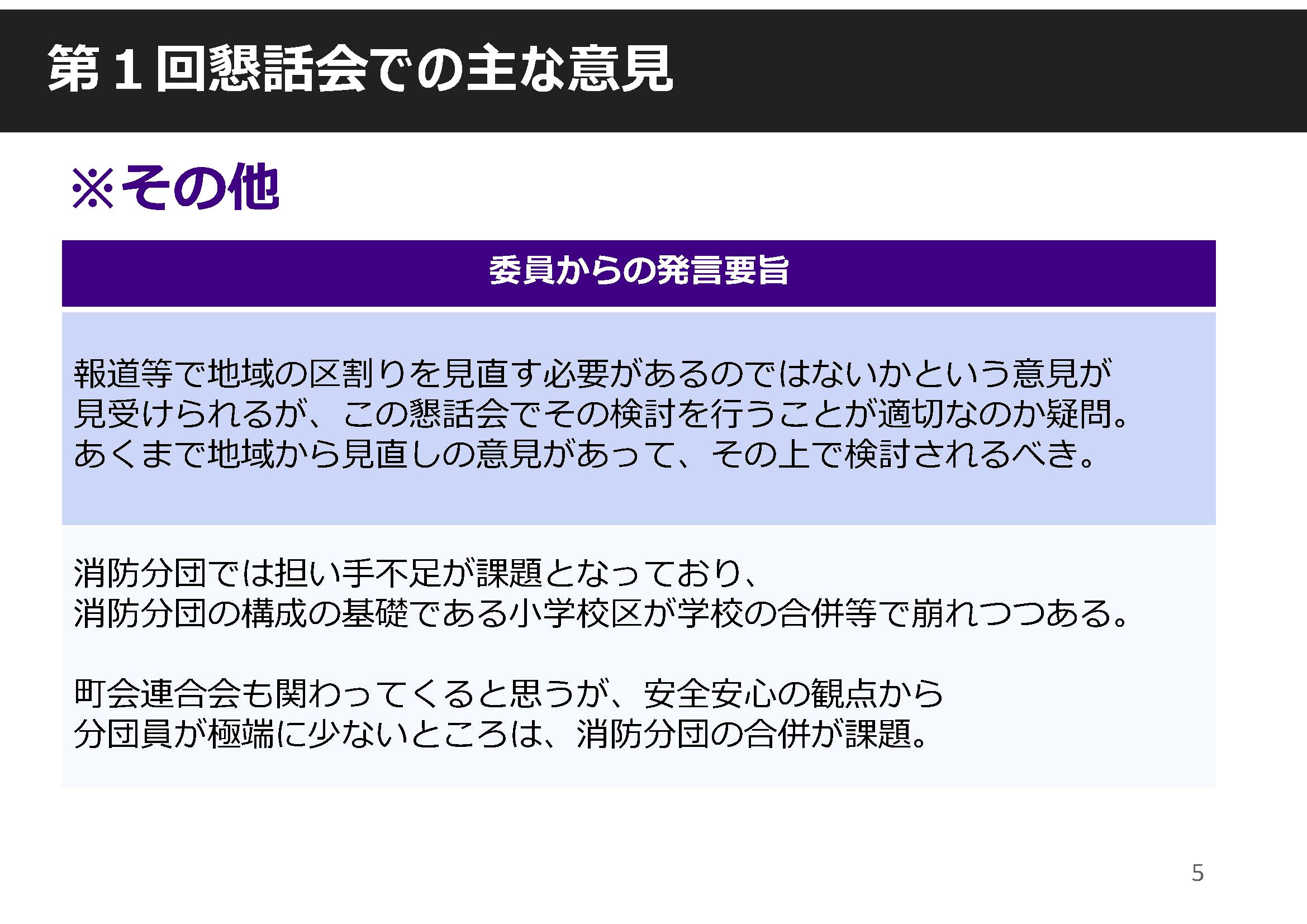 町会連合会も関わってくると思うが、 安全安心の観点から分団員が極端に少ないところは、 消防分団の合併が課題。