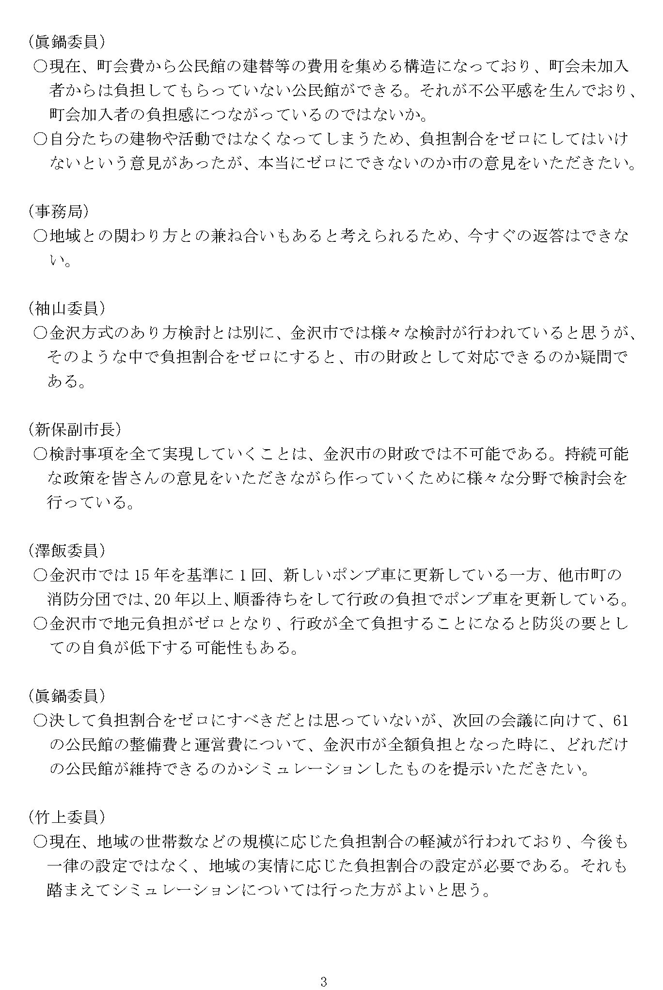 ○決して負担割合をゼロにすべきだとは思っていないが、次回の会議に向けて、61の公民館の整備費と運営費について、 金沢市が全額負担となった時に、 どれだけの公民館が維持できるのかシミュレーションしたものを提示いただきたい。