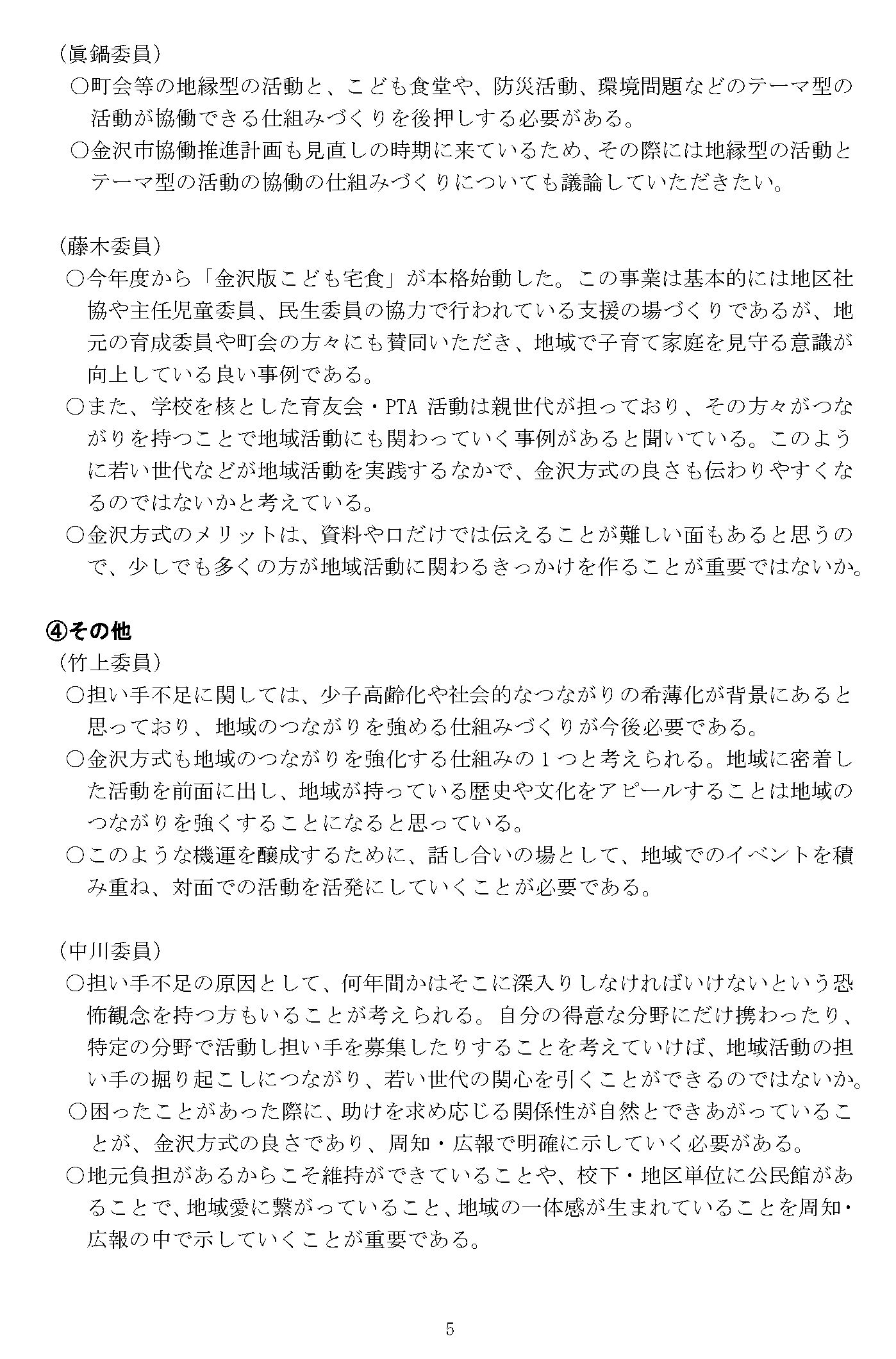 ○金沢市協働推進計画も見直しの時期に来ているため、その際には地縁型の活動とテーマ型の活動の協働の仕組みづくりについても議論していただきたい。