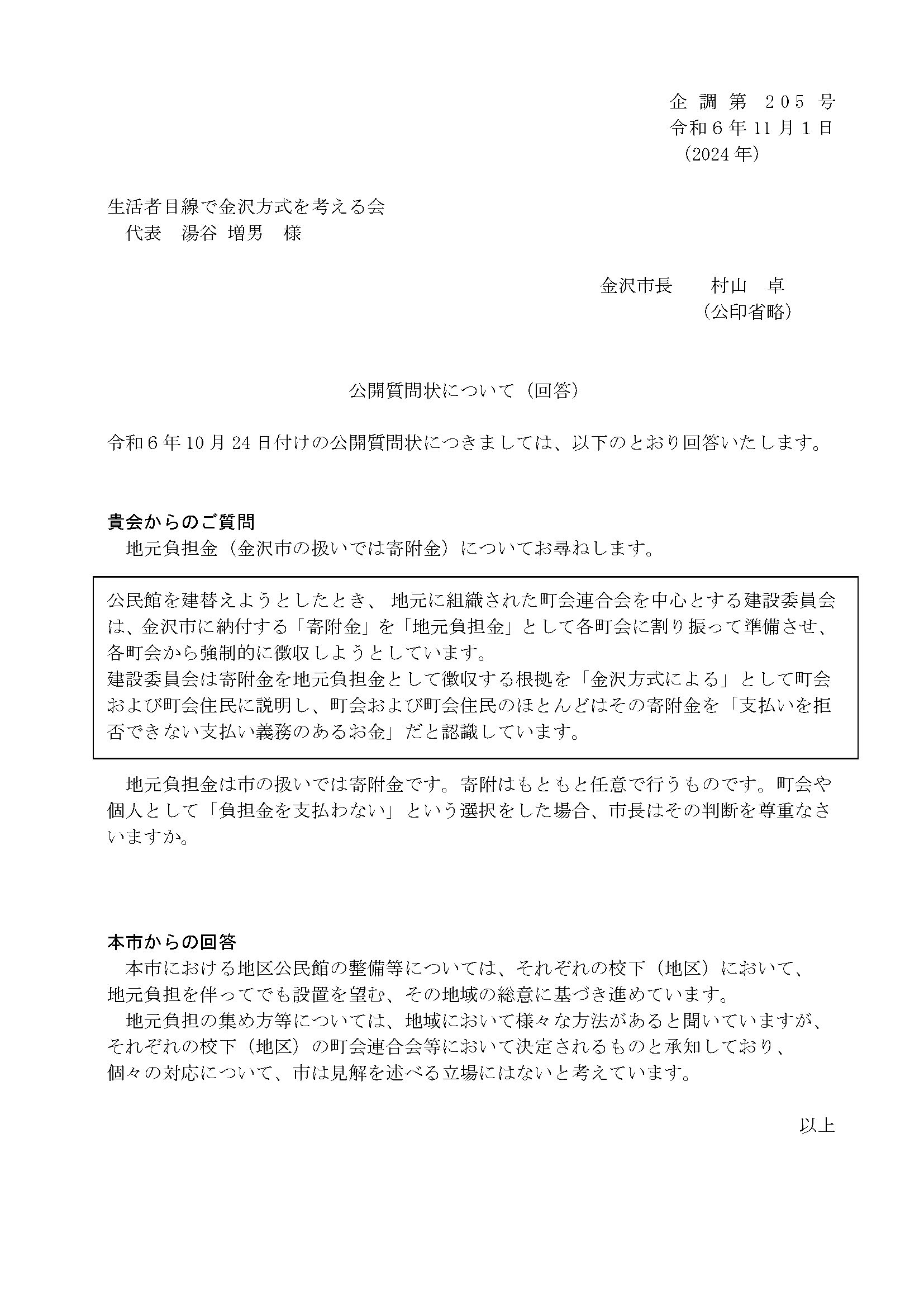 令和6年10月24日付けの公開質問状につきましては、以下のとおり回答いたします。