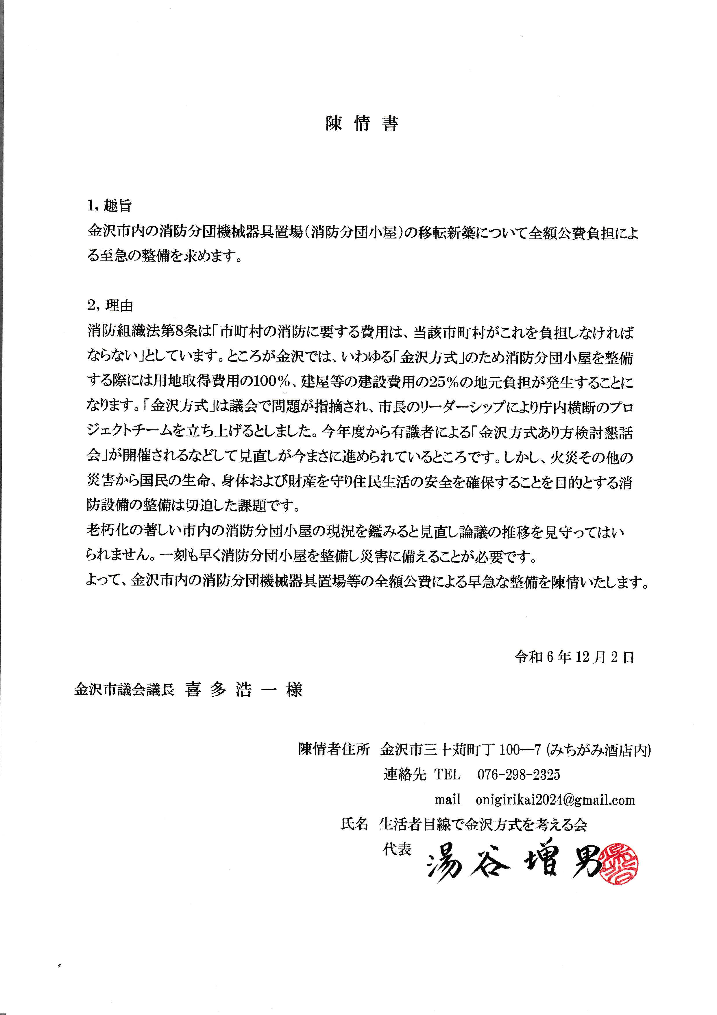 よって、金沢市内の消防分団機械器具置場等の全額公費による早急な整備を陳情いたします。