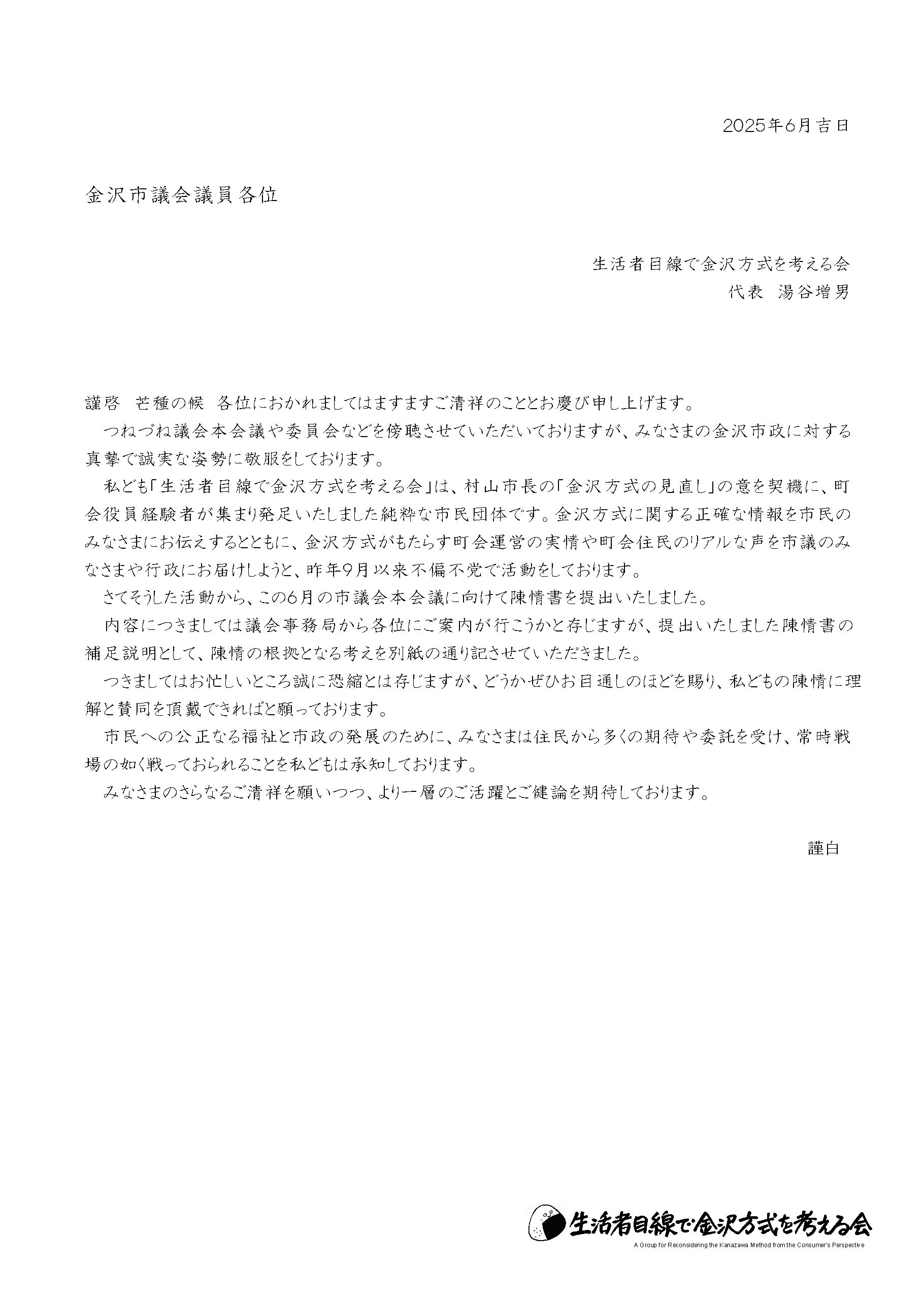 内容につきましては議会事務局から各位にご案内が行こうかと存じますが、 提出いたしました陳情書の補足説明として、陳情の根拠となる考えを別紙の通り記させていただきました。