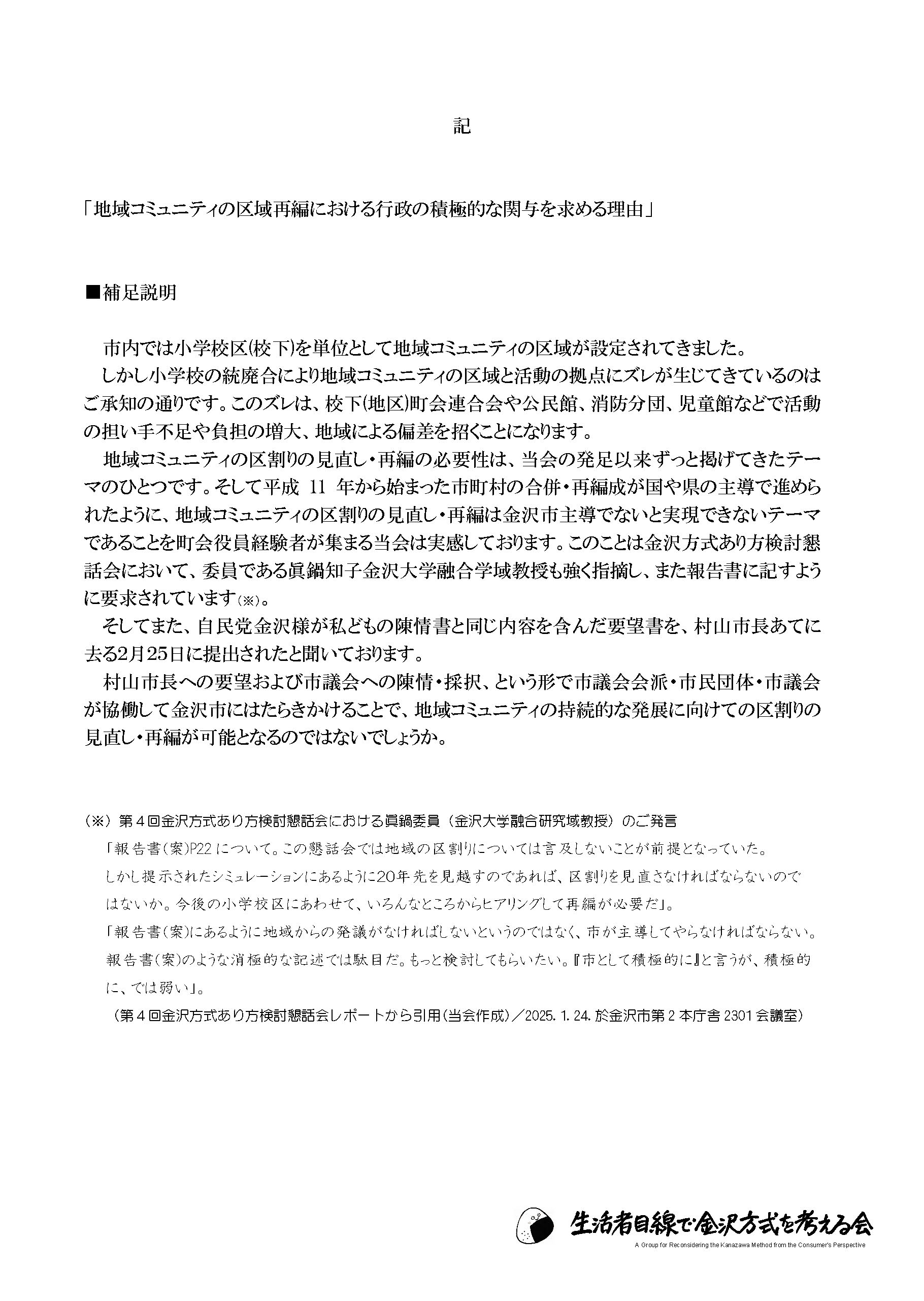 村山市長への要望および市議会への陳情・採択、 という形で市議会会派・市民団体・市議会が協働して金沢市にはたらきかけることで、 地域コミュニティの持続的な発展に向けての区割りの見直し・再編が可能となるのではないでしょうか。
